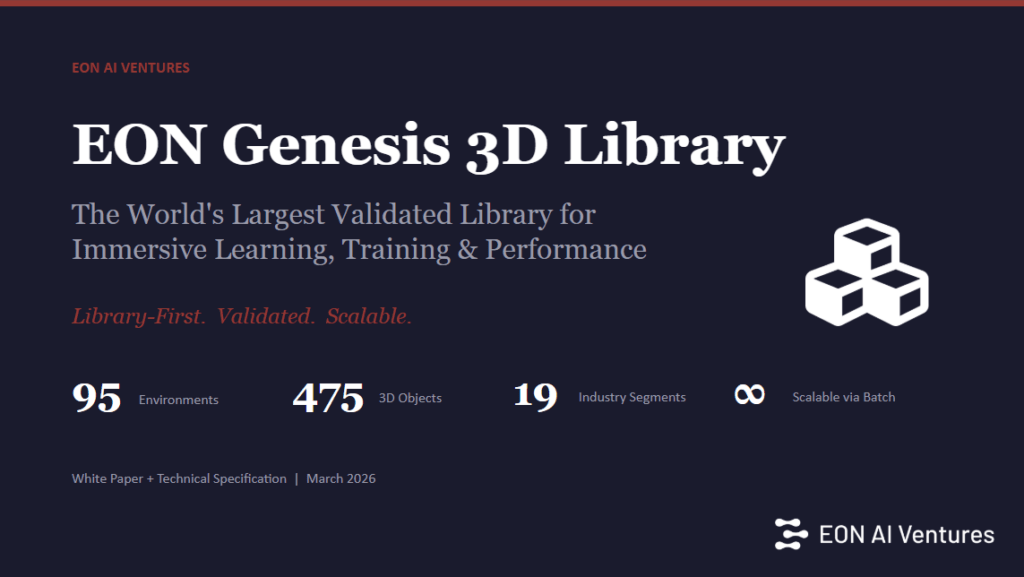 IRVINE, CA – March 31, 2026 – EON AI Ventures today announced the launch of the EON Genesis 2.0 Library, the world’s most comprehensive and validated 3D library designed specifically for immersive learning, training, and performance. This groundbreaking platform introduces a revolutionary “library-first” approach, replacing the formerly expensive and bespoke creation of immersive content with reusable, training-ready assets that scale across industries and applications.